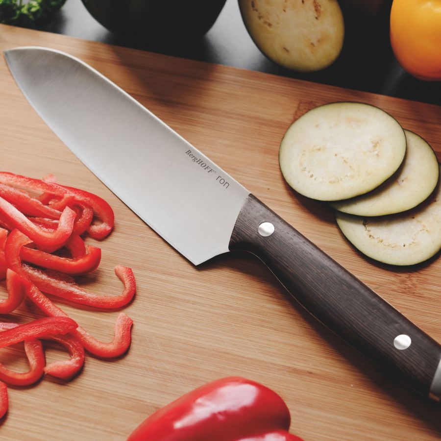 Denne Santoku-kniven på 17,5 cm fra BergHoff er perfekt for å kutte grønnsaker så vel som å skjære kjøtt. Knivbladet er laget av rustfritt stål, noe som gjør at det beholder skarpheten lenger. Skaftet er laget av mørkt tre og ligger godt i hånden for et sikkert og komfortabelt grep.
