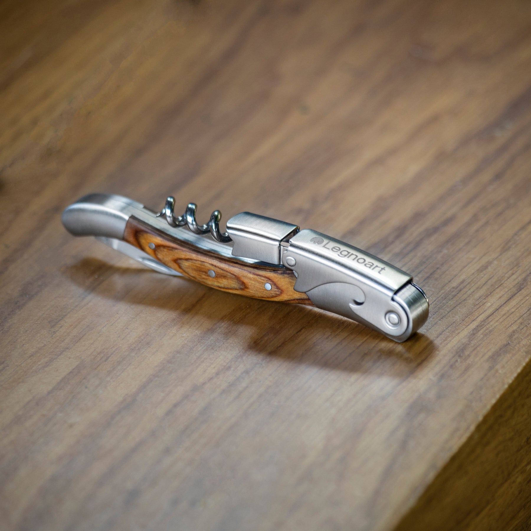 En solid og slank vinopptrekker, eller servitørkniv, fra italienske Legnoart. Dette er en stilig vinåpner laget av rustfritt stål, med håndtak i pakka-tre.