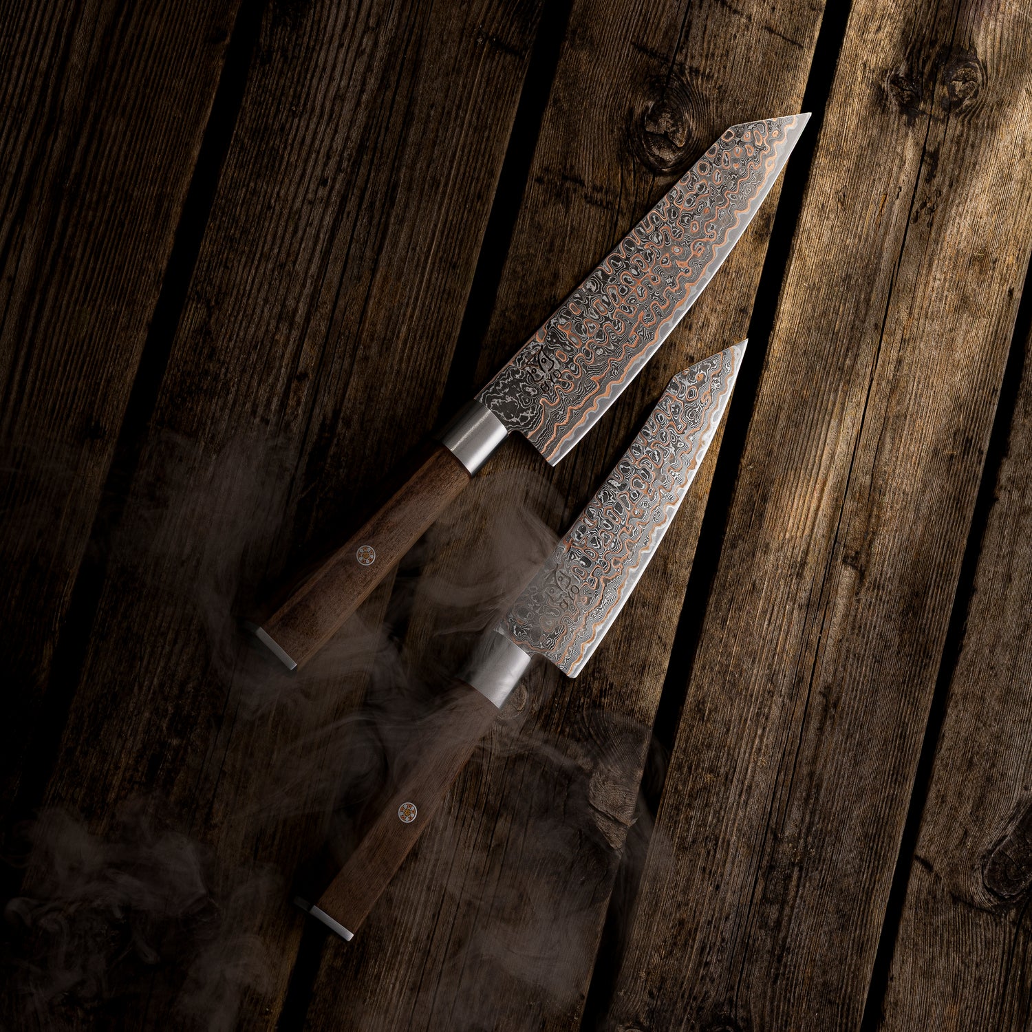Damaskusstål med kobber for styrke, presisjon og et unikt spill i stålet. Kobberkomponentene forbedrer knivens seighet og redusere risikoen for avskalling eller brudd ved kutting av harde ingredienser.