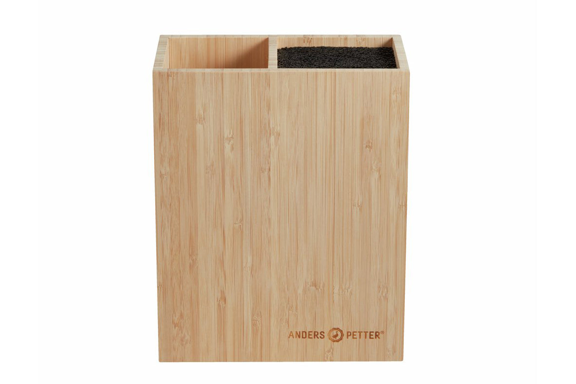 En stilren knivblokk med eget oppbevaringsrom for kjøkkenredskaper, laget av naturlig bambus. Knivstativet er utformet med fleksible plastfiberstrå som tilpasser seg hver knivs unike form og størrelse, noe som beskytter de skarpe knivseggene mot slitasje.