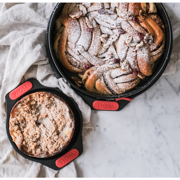 Woll Bake It springform har en jevn varmefordeling og har en lang levetid. Formen er laget av korrosjonsbestandig aluminert stål og har varmebestandige silikongrep som gir godt og sikkert grep når den skal håndteres.
