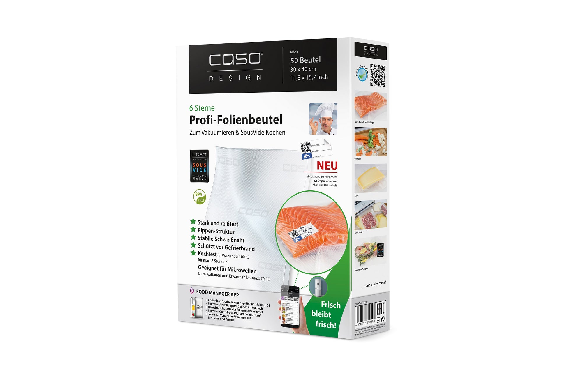 Ekstra tykke folieposer fra Caso som egner seg for vakuumering av matvarer, som dermed øker holdbarheten betraktelig og beskytter mot frostskader ved frysing.