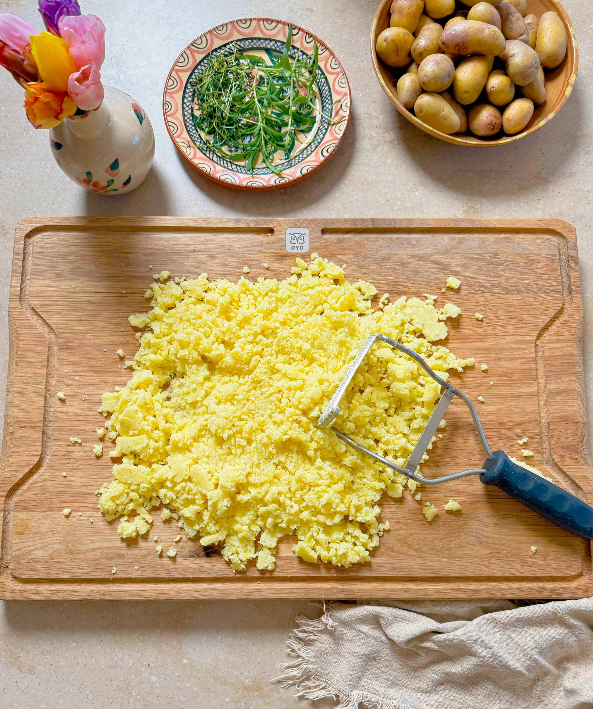 En stor og solid eikefjøl i oljet heltre designet av Mats Herding Solberg for Øyo. Avrenningsspor for væske fra kjøtt og andre matvarer rundt hele kanten på den ene siden av fjøla. Eik er et levende materiale som naturlig inneholder antistoffer som motvirker bakteriedannelse.