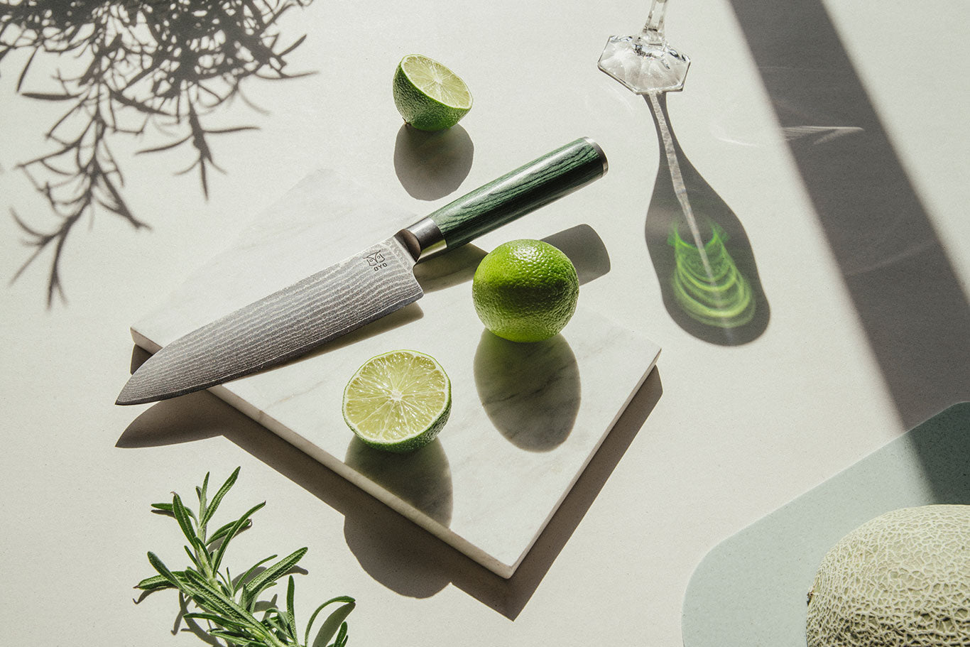Skarvet i grønn er inspirert av edelstenen smaragd med sin dypgrønne farge, klarhet og gjenskinn. Knivbladet er i damask som er bygget opp rundt en kjerne av VG-10 stål med hele 66 lag stål med 431 og 304 stål. VG-10 stålets hardhet gjør at knivens slip får en skarphet som vil gi deg en helt spesiell følelse når du lager mat.