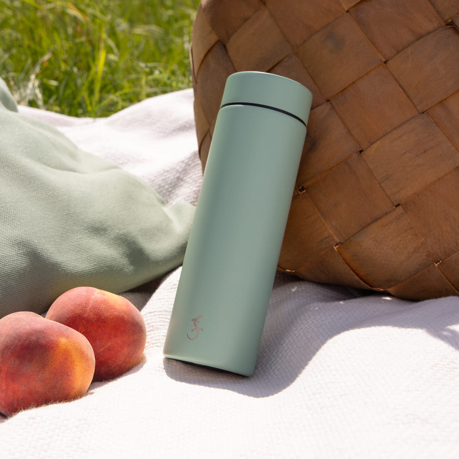 En liten, lett og kompakt termos i lakkert rustfritt stål.