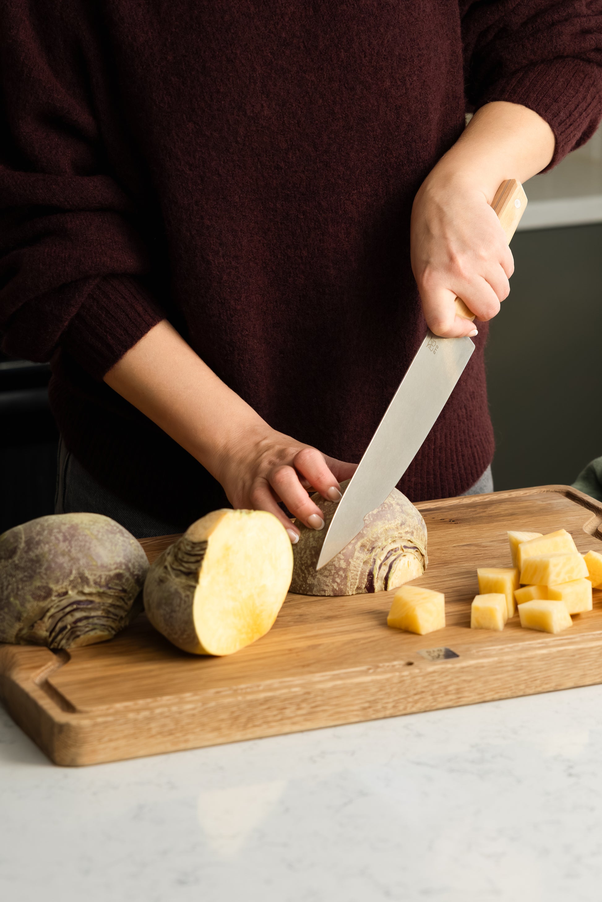 Vedalen kokkekniv er en pålitelig følgesvenn på kjøkkenet laget av eksklusivt, steinvasket Sandvikstål. Med en imponerende balanse og tyngde gir denne kniven deg presise og kraftige kutt hver gang. Det ergonomisk utformede treskaftet gir en behagelig og sikker grep, noe som gjør den til et ideelt valg for både profesjonelle og hjemmekokker. Denne allsidige kniven fungerer også utmerket som en tradisjonell trancherkniv.